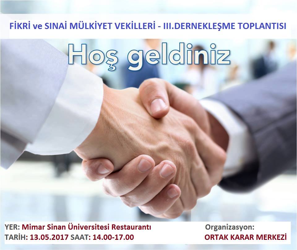 Marka ve Patent Vekilleri, Akademisyenler, Avukatlar, Arabulucular başta olmak üzere Fikri ve Sınai Mülkiyet hakları ile ilgili alanlarda çalışan ilgi duyan insanları bir çatı altında toplamayı hedefleyen  Fikri ve Sınai Mülkiyet Vekilleri Dernekleşme  Toplantısı’ nın 3.sü önceden kararlaştırıldığı gibi 13 Mayıs 2017 tarihinde 14.00 de Mimar Sinan Üniversitesi’ nde yapıldı.